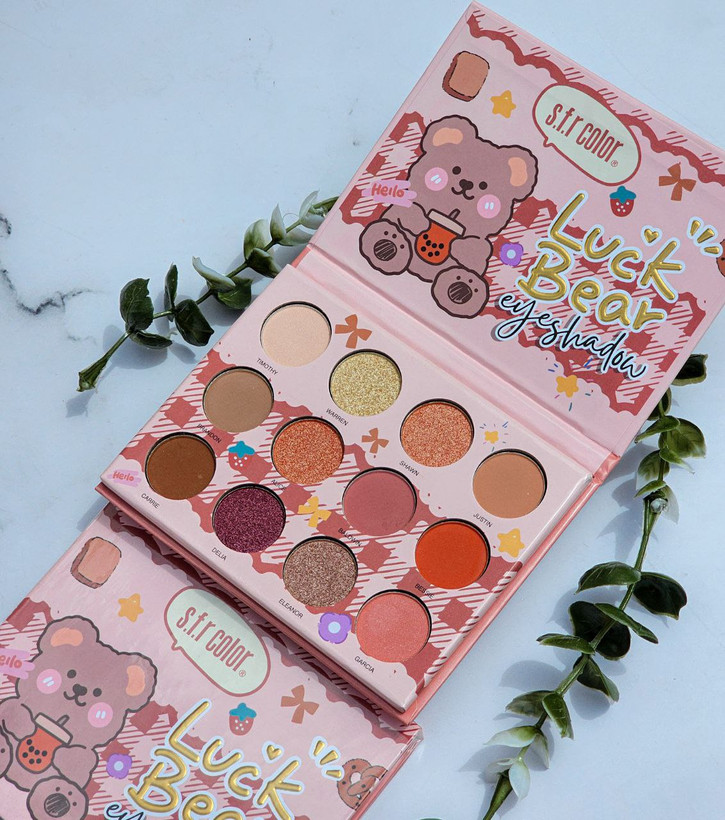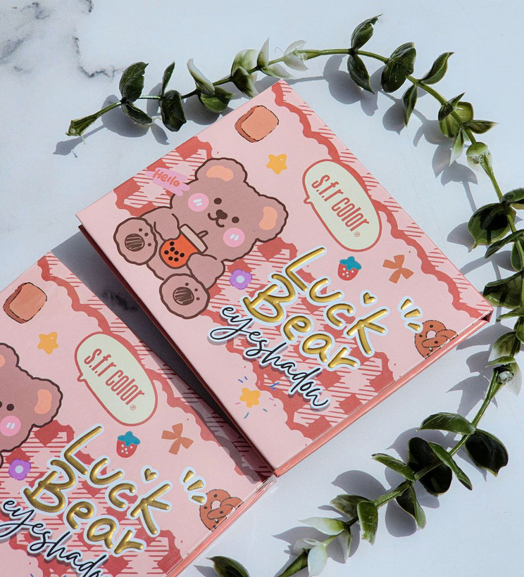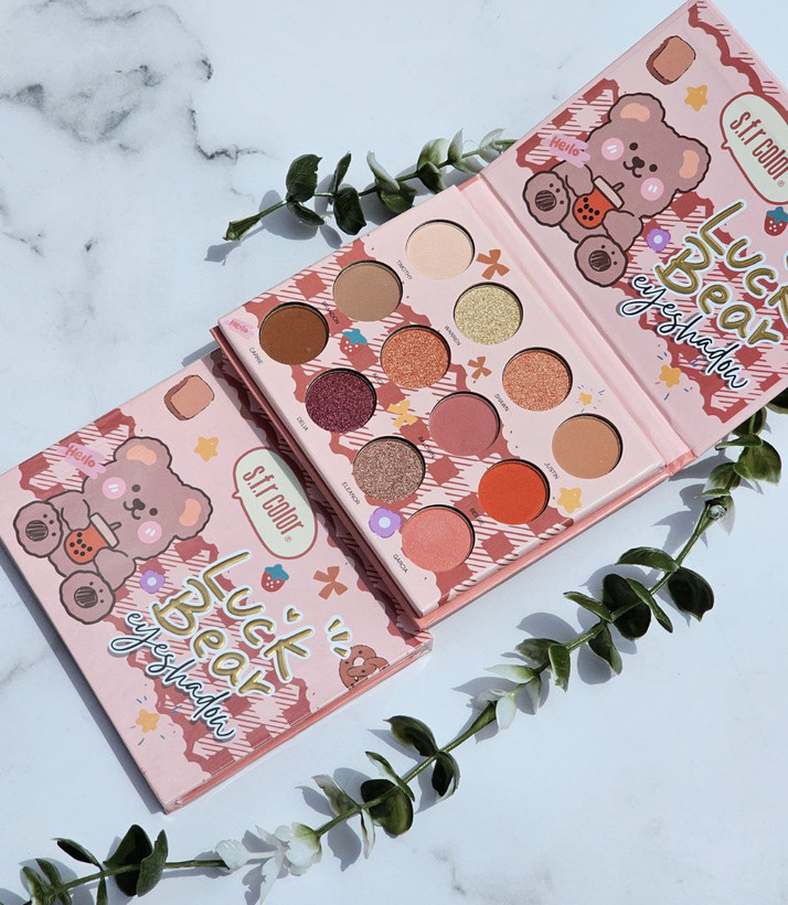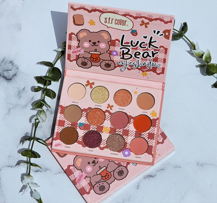eyeshadow" از برند "s.f.r color" است. این پالت شامل ۱۲ رنگ مختلف سایه چشم با نامهای مشخص (مانند TMOTHY، WARREN، SHAWN، JUSTIN، CARRE، DELIA، ELEANOR، GARCIA) است. طرح روی پالت یک خرس کارتونی بامزه را نشان میدهد که در حال نوشیدن بوبا است و تم رنگی آن صورتی و شاد است. این پالت برای آرایش چشم و ایجاد ظاهرهای متنوع مناسب است.